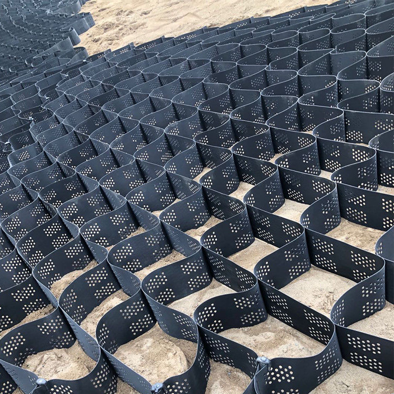 HDPE GeocSie haben eine spezielle Oberflächenstruktur, die einen optimalen Kontakt zwischen den Geozellen und dem Füllmaterial gewährleistet.Die Zellwände sind durchbohrt, um eine hydraulische Verbindung zwischen den einzelnen Taschen herzustellen und überschüssiges Wasser abzuleitenDie Perforation bietet Wurzeln einen Weg, zwischen den Zellen zu wachsen.